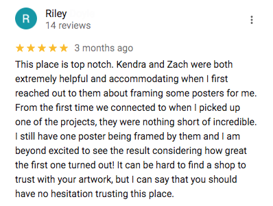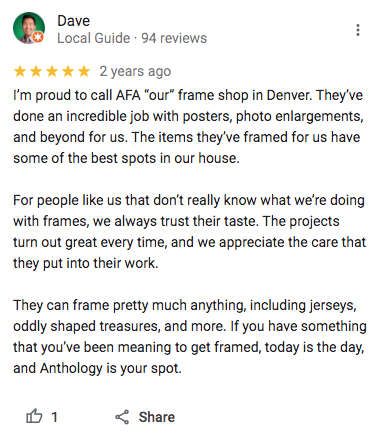 We have a large selection of custom frames available to suit many styles and budgets. Anthology was established in 2010 by Zach and Kendra Custer, who have been picture framing for a combined 40 years in the Denver metro area. Both owners come from a background in fine art and keep current with the latest color and design trends. We want to offer you the best design service and framing so design consultations are always free and encouraged. Our goal is to give you the highest quality picture framing and customer experience.