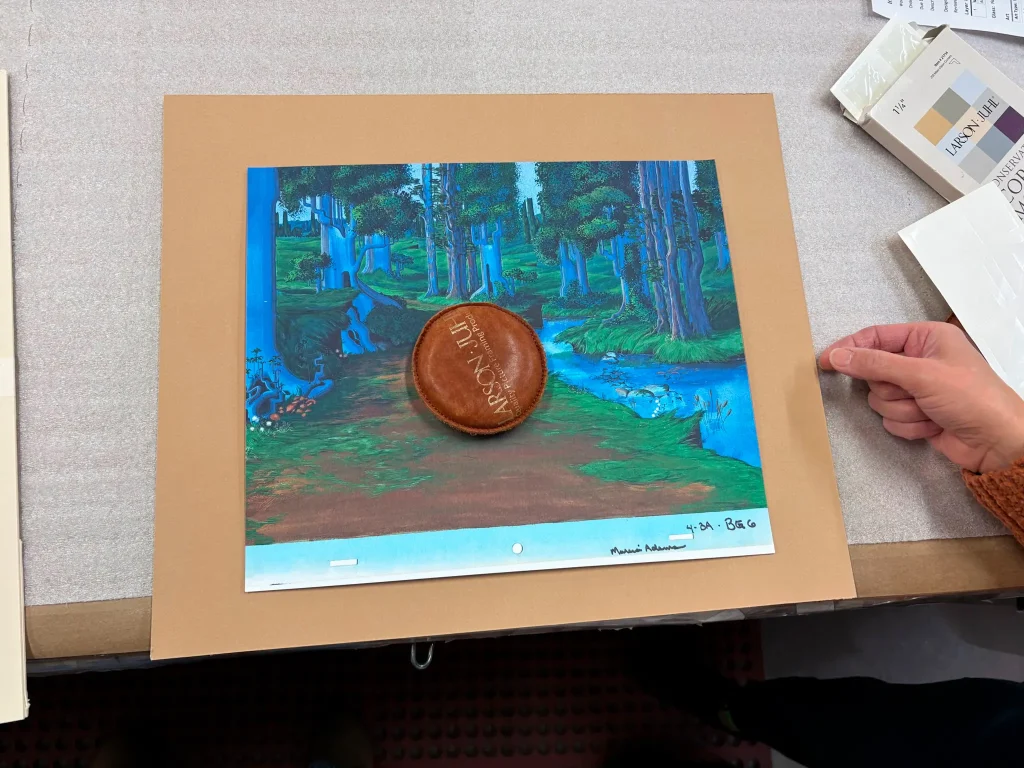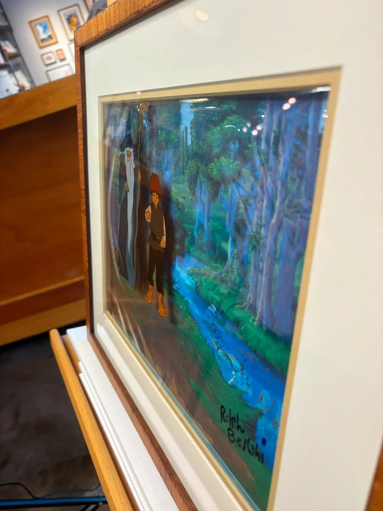 However, all of the effort that went into the animation would not be wasted. Bakshi currently sells his original film cels, for LOTR in addition to other projects, and that is how this project fell into our lap. Our client purchased this cel of Frodo and Gandalf walking through The Shire, and we knew we’d want to preserve the cel in a way that truly honored the time that went into creating it.