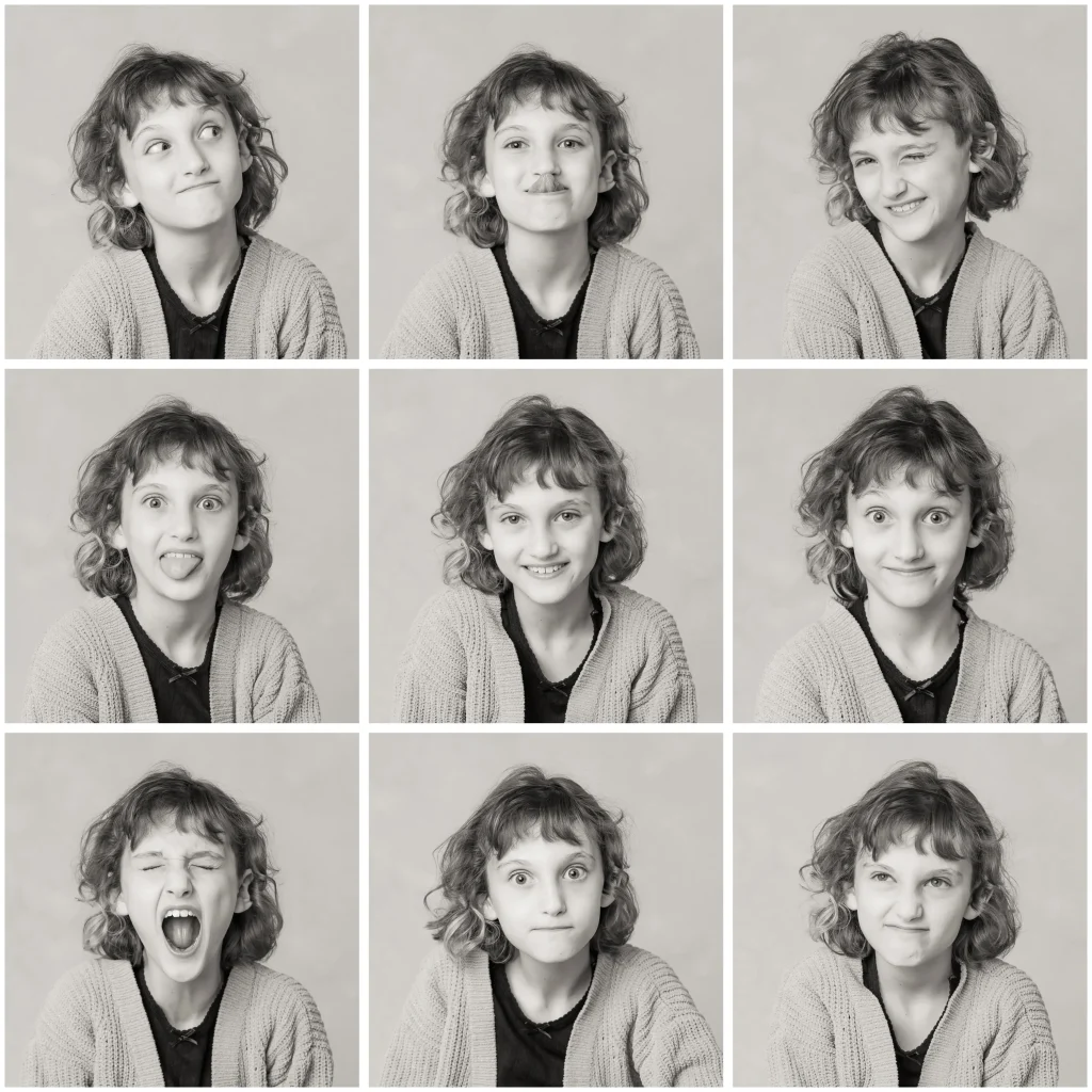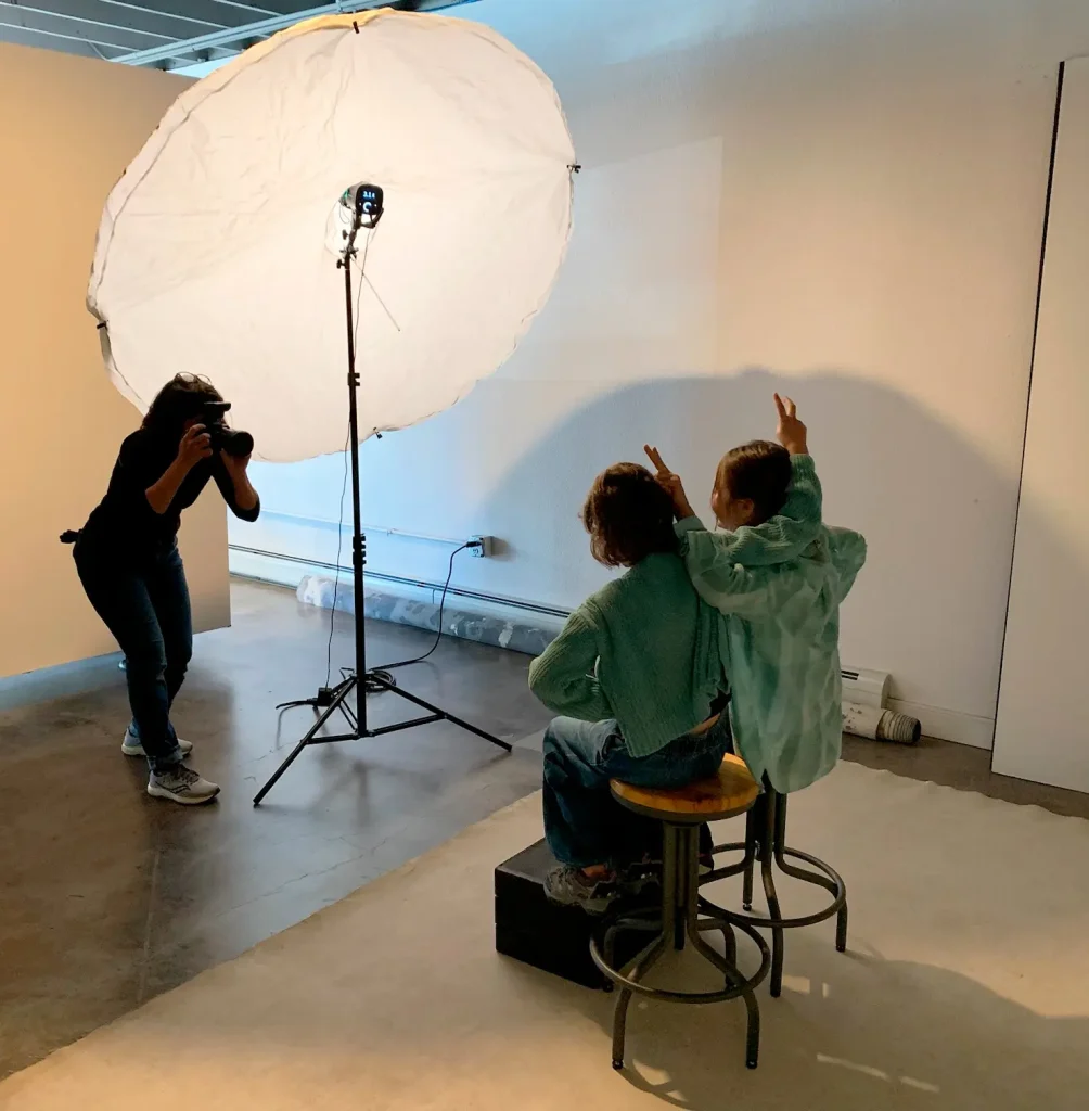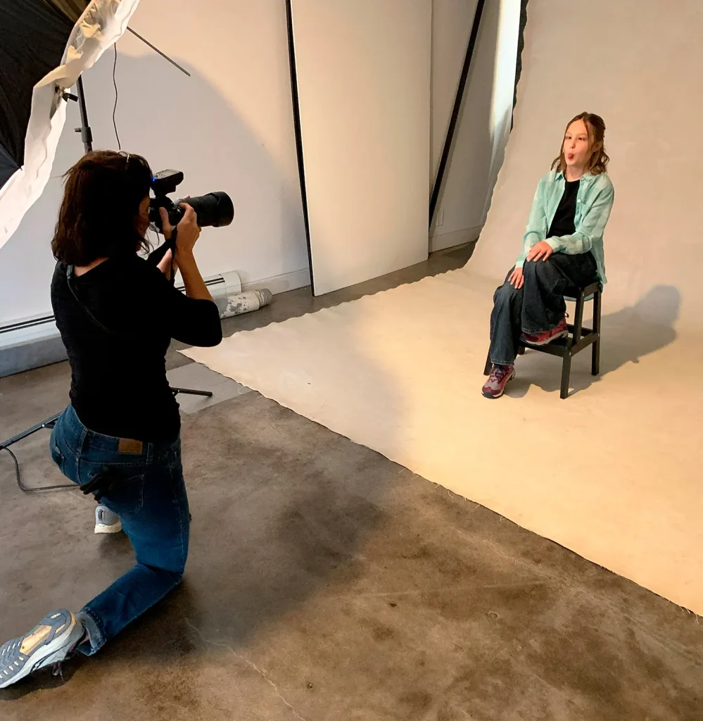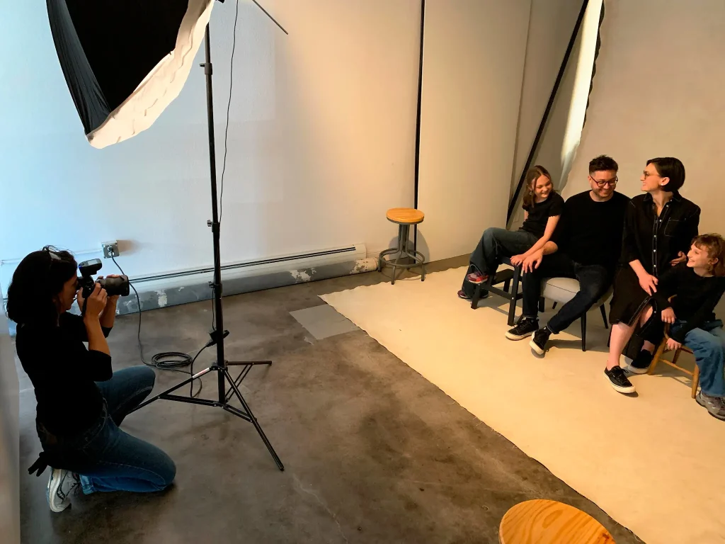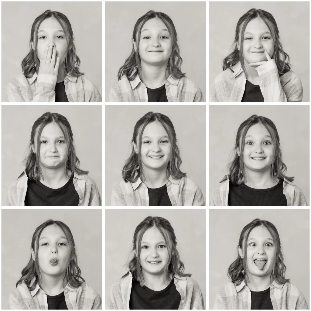 Once we iron out all the details, the fun begins! If you decide you’d like to go with a location shoot we will meet you there on that day with anything we may need during the session – hairspray, glasses wipes, a lint roller? We’ve got you covered, in addition to all the lighting we will need to bring your photographs to life! If you prefer a studio session, we’ll book you before or after our usual store hours to allow for privacy during your photos and let you choose the soundtrack for your session! This family chose Elton John radio for theirs, and we have to say they have great taste. This session was extra silly because they chose to go with a 9 series for each of their two girls to capture their many expressions and personalities to display all in one frame. This made for some really fun faces, poses, and prompts!